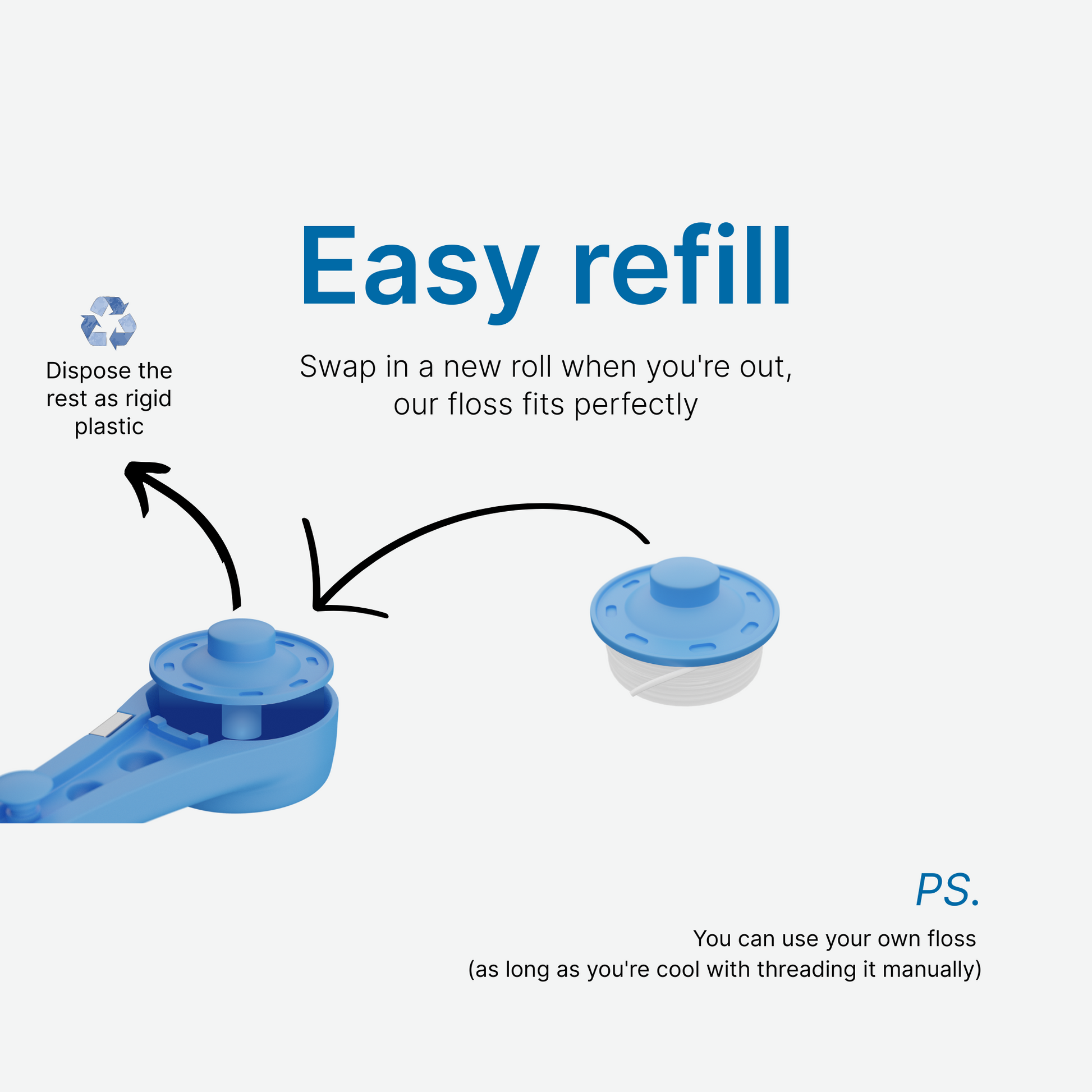 Each Flossy comes with 30m of premium floss, enough for up to 1000 uses or 3 years of daily flossing.